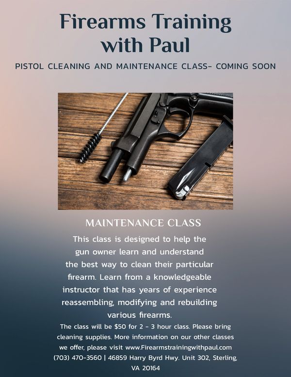 This class is designed to help you learn and understand the best way to clean your firearm. Learn from a knowledgeable instructor that has years of experience reassembling, modifying and rebuilding various firearms. The class is 2 -3 hours. Please bring your cleaning supplies to class. The fee will be $50.00